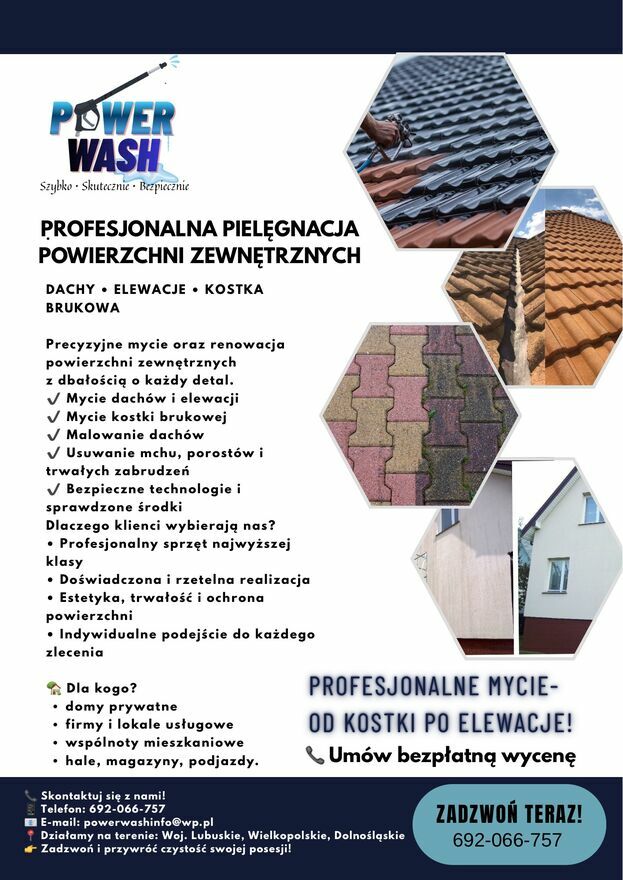 PROFESJONALNE CZYSZCZENIE POWIERZCHNI – MYCIE, IMPREGNACJA, MALOWANIEOferujemy kompleksowe usługi czyszczenia i konserwacji powierzchni zewnętrznych z wykorzystaniem profesjonalnego sprzętu wysokociśnieniowego oraz podgrzewanej wody, co gwarantuje skuteczność i bezpieczeństwo dla czyszczonych materiałów.